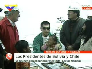 Morales fue recibido por su homólogo chileno, Sebastián Piñera, minutos antes de que ascendiera a la superficie el undécimo minero rescatado, Jorge Galleguillos.