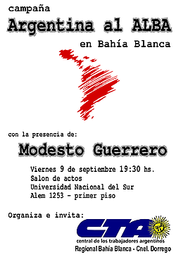 El papel de las clases populares de cada uno de los países de la Alianza Bolivariana estimula a diversos sectores sociales de nuestro país a dar la pelea por la incorporación de la República Argentina a este proyecto liberador. Por ello, conscientes del rol fundamental de los movimientos sociales de base como artífices del cambio, hacemos llegar al conjunto de las organizaciones políticas, sociales y sindicales de nuestra nación, y a la población en general la invitación a convertirse en protagonistas y parte activa de nuestra propuesta.
