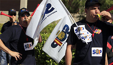 Madrid, julio 17 de 2012. – Sin descanso y por quinto día consecutivo, los funcionarios se están echando hoy a las calles de Madrid contra los recortes anunciados el viernes por el Gobierno a sus condiciones laborales y a sus sueldos. A la ola de protestas se sumaron hoy agentes de Policía Nacional fuera de servicio. Un centenar de ellos, convocados por los sindicatos Confederación Española de Policía (CEP) y Unión General de Policías (SUP), se concentró a las diez de la mañana a las puertas del complejo policial de Canillas en Madrid, donde se celebraba un acto de presentación de nuevos agentes para la capital, presidido por el director general de la Policía, Ignacio Cosidó.