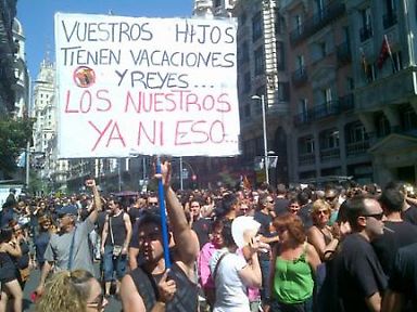 En su trayecto, los manifestantes se están dirigiendo a la plaza de Cibeles llevando féretros que simbolizan la muerte de sus derechos. Muchos de los protestantes visten de luto y gritan «esto es un atraco».
