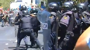 Los disturbios empezaron cuando algunos de los manifestantes intentaron tirar las vallas de protección que rodean al Ministerio de Industria y lanzaron petardos y piedras contra los furgones de la Policía. Los efectivos antidisturbios, en tanto, respondieron con balas de goma.