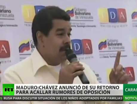RT 21 Feb. 2013.- El vicepresidente venezolano, Nicolás Maduro, explicó por qué Hugo Chávez decidió anunciar él mismo su retorno, asegurando que lo hizo para «acallar rumores» de la oposición sobre su estado de salud. Navegación de entradas Venezuela rechaza injerencia de Estados Unidos en asuntos internos(VIDEO) Ministro Villegas: Insuficiencia respiratoria del presidente Chávez persiste