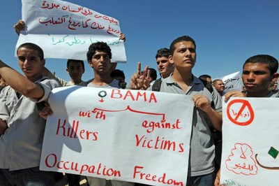 Palestinos salieron a las calles y destruyeron un estandarte con la imagen de Obama, así como también arrancaron una pancarta con su rostro, la arrojaron sobre la calles e hicieron que coches le pasaran por encima, hasta finalmente prenderle fuego.