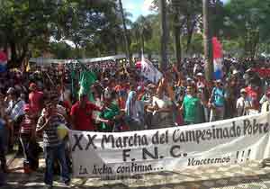 «Federico Franco, presidente transgénico», señaló uno de los lemas principales, en alusión a la relación del mandatario con las transnacionales que venden ese tipo de semillas, mientras otros denunciaban al gobierno por su compromiso con los latifundistas en perjuicio de los campesinos pobres.
