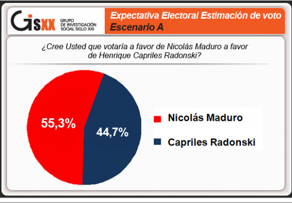 07/04/13.-El Grupo de Investigación Social Siglo XXI (GISXXI) dio a conocer este sábado que el candidato socialista Nicolás Maduro cuenta con 55,3% de intención de voto y el candidato antichavista Henrique Capriles Radonski con 44,7%.
