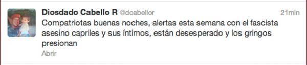 «Compatriotas, buenas noches. Alertas esta semana con el fascista asesino Capriles y sus íntimos. Están desesperados y los gringos presionan» escribió el presidente de la AN.