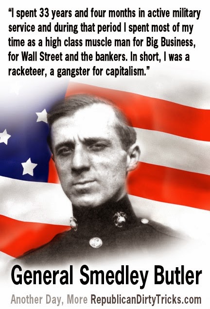 En su obra La guerra es un latrocinio, Butler describe a esta como a un robo, un negocio sucio, que no es bien entendido como funciona por la gente corriente de un país, y solo un pequeño grupo, los dirigentes, son perfectamente conscientes para qué sirve y a quién sirve. Es llevada a cabo para el beneficio de estos pocos a costa del sacrificio de los demás. Los beneficios que se obtienen con la guerra son enormes para esa clase privilegiada dirigente, ya que evitan cualquier rivalidad de los competidores en un libre mercado, además, se dispara la demanda y, como consecuencia, los precios, y toman por la fuerza lo que bien les conviene. Esto posibilitó que se hiciesen enormes fortunas en EE.UU. a costa de los estadounidenses y de otros países en la Primera Guerra Mundial.