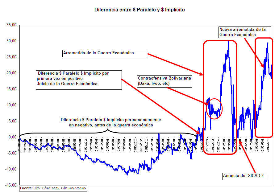 Recordando algunas cifras que en algún momento revisé, le dije que la Guerra Económica comenzó con la llegada del Presidente Maduro a la Presidencia (incluso como encargado) y se podía ver claramente en la distorsión de precios del Dólar Paralelo con respecto al Dólar Implícito y por tanto en al alto costo de la vida.