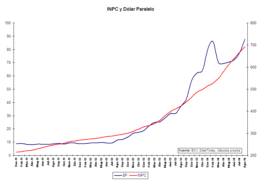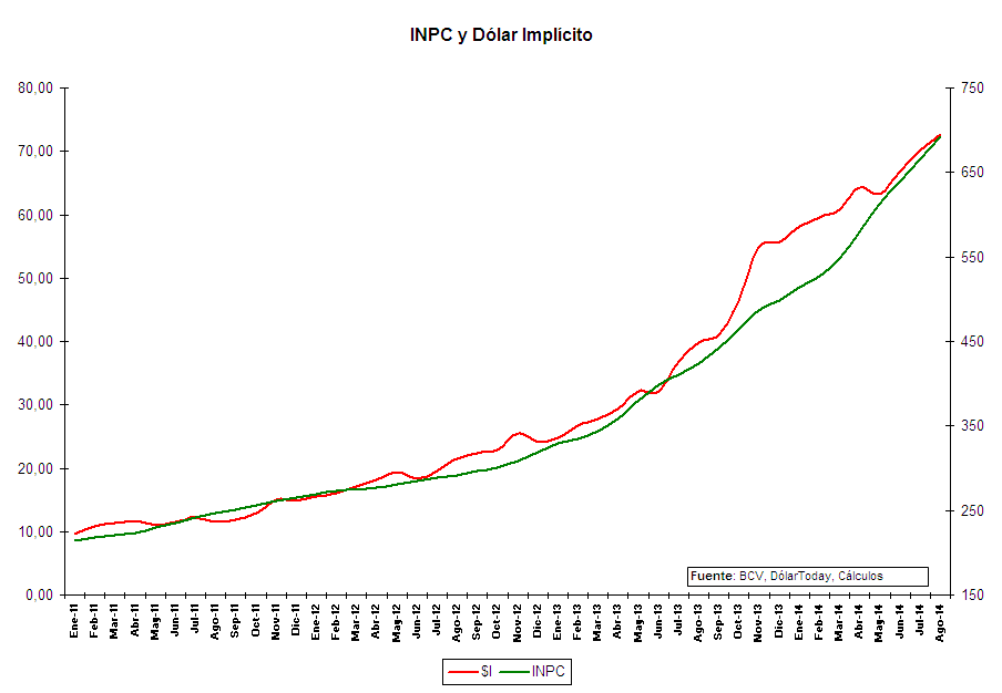 De esta forma queda demostrada la relación entre el costo de la vida (INPC) y el precio del Dólar Paralelo y con mucha mas fuerza entre al costo de la vida y el Dólar Implícito.