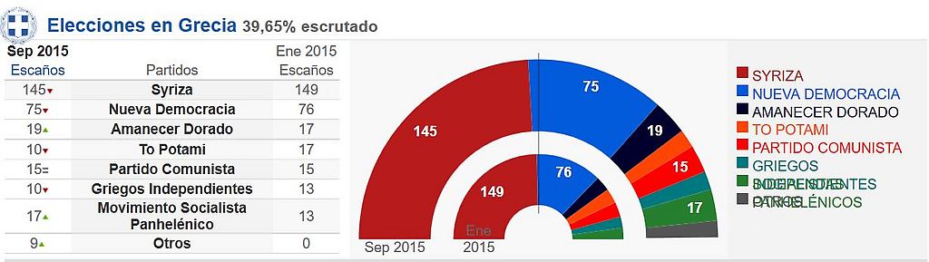 20-09-15.-El partido Syriza ganó las elecciones legislativas griegas de acuerdo con el escrutinio del 45% de votos difundido por el ministerio del Interior. Según este conteo, Syriza lograría el 35,5% de los apoyos y los conservadores de Nueva Democracia el 28%.