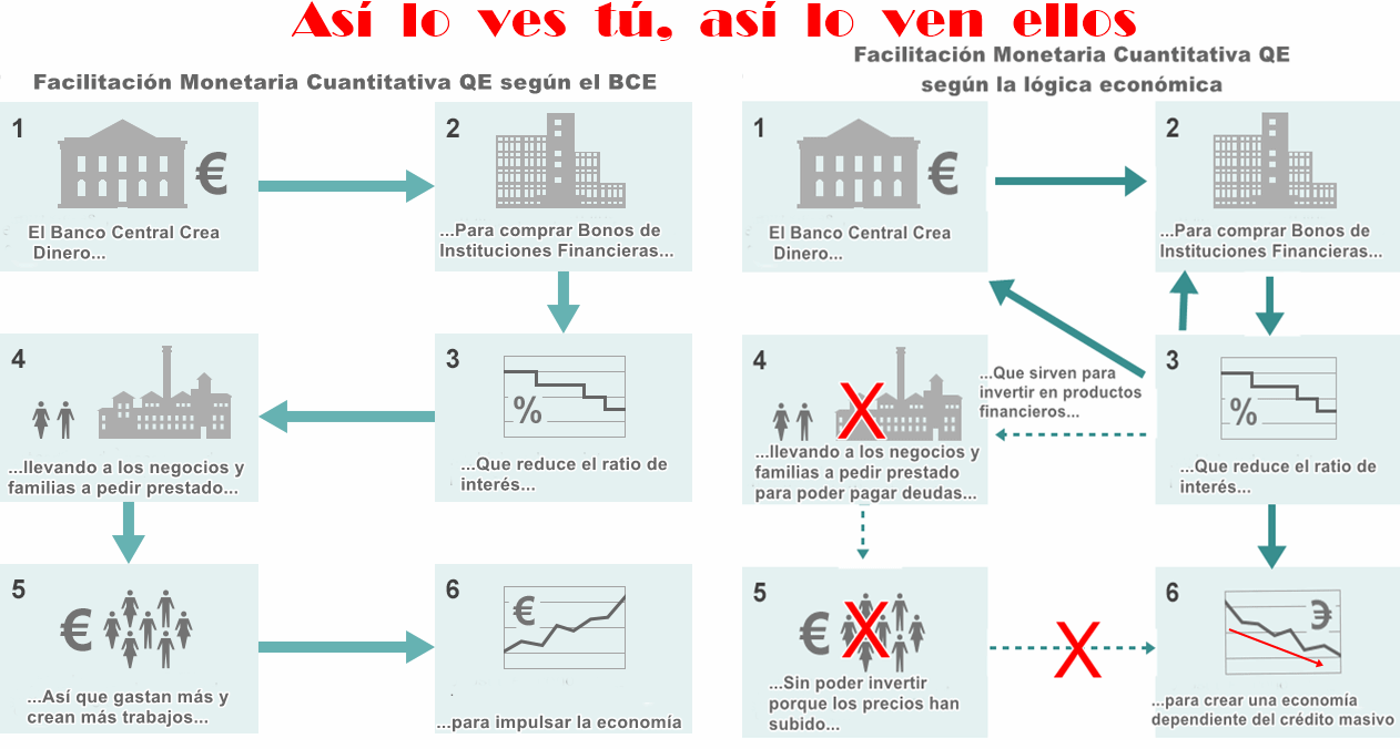 El BCE pretende reactivar la economía inyectando dinero directamente en las empresas introduciendo un incentivo que bancos y corporaciones se endeuden, llamado Quantitative Monetary Expansion o QE. ¿Cuál es el mejor remedio para activar una economía paralizada por la inversión especulativa, por un exceso de dinero cuyo único beneficiario son los bancos y corporaciones? Respuesta del BCE: más dinero para bancos y corporaciones.