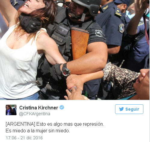 Asimismo, la ex presidenta de Argentina, Cristina Fernández de Kirchner, utilizó su cuanta twitter para condenar tal acción, y adjunto a vídeos, expresó “represión a una legisladora de la nación”.