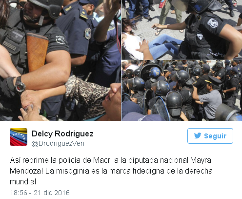La ministra de Relaciones Exteriores de Venezuela, Delcy Rodríguez, a través de su cuenta twitter @Dodriguezven, escribió “así reprime la policía de Macri a la diputada nacional Mayra Mendoza. La misoginia es la marca fidedigna de la derecha mundial”, esto vinculado a las agresiones que días atrás, la canciller fue víctima en esta misma nación, también por policías, cuando se dirigía a la reunión de cancilleres del Mercado Común del Sur (Mercosur).