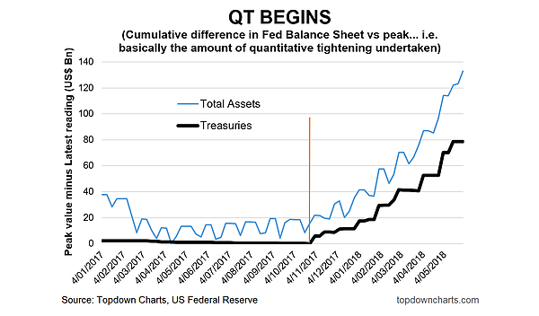 Ahora la Fed ha comenzado QT – Ajuste cuantitativo – el reverso del QE. A fines de 2014, la Fed dejó de comprar nuevos bonos del mercado. A fines de 2017, la Fed lentamente comenzó a reducir sus tenencias de bonos, lo que reduce la liquidez en dólares en el sistema bancario. La reducción de las tenencias de bonos de la Fed a su vez empujó las tasas de interés de los bonos al alza. Hasta este verano, todo fue «suave sueave».